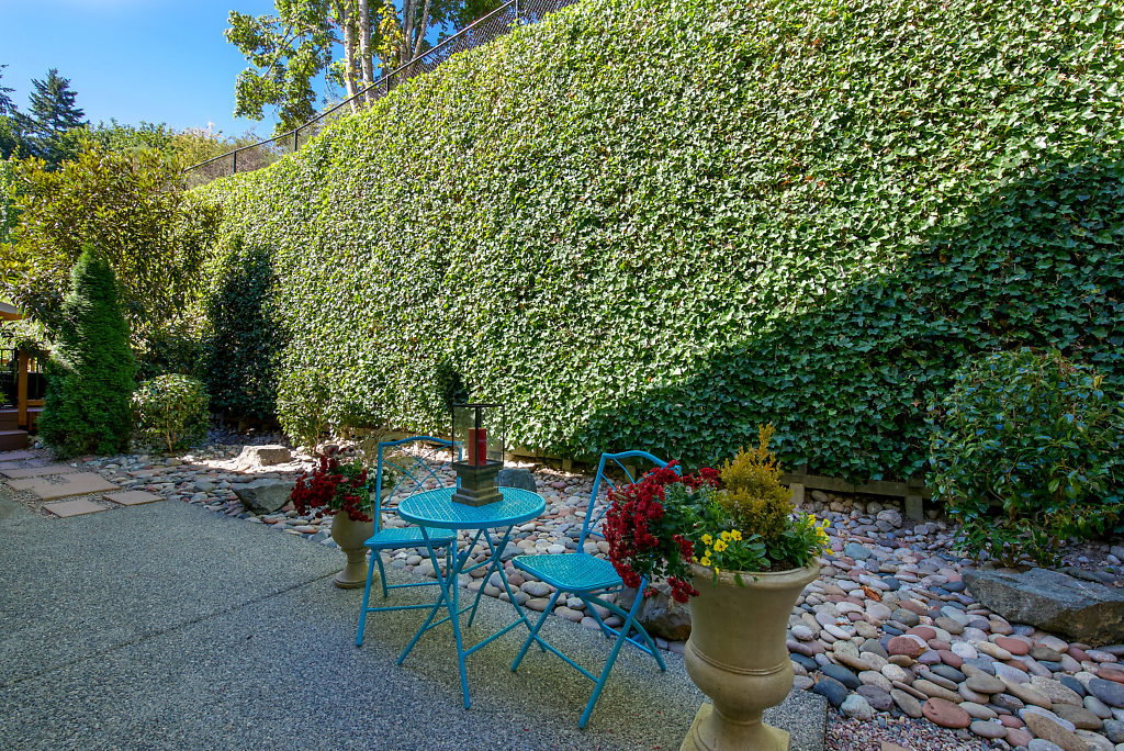 Beyond the kitchen is the low-maintenance backyard patio, perfect for enjoying summer days. The ivy covers a concrete retaining wall, beyond which is a greenbelt that will never be developed.
