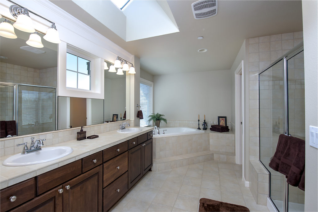 The luxurious 5-peice ensuite mater bath has a granite counter top, ceramic tiles, a skylight, a large linen closet, a glass shower, and a corner tub.