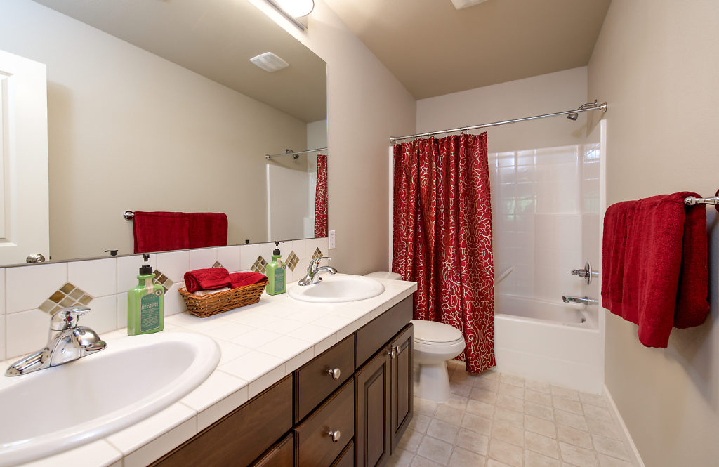 The first of two upstairs bathrooms has a beautiful tile counter top as well as two sinks, making it perfect for kids to share.
