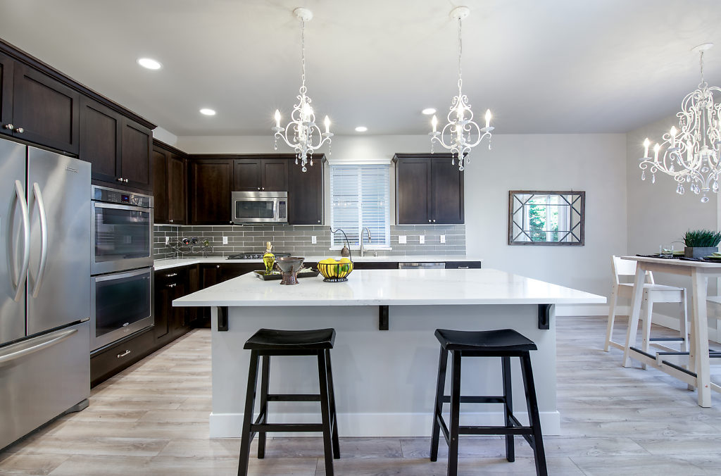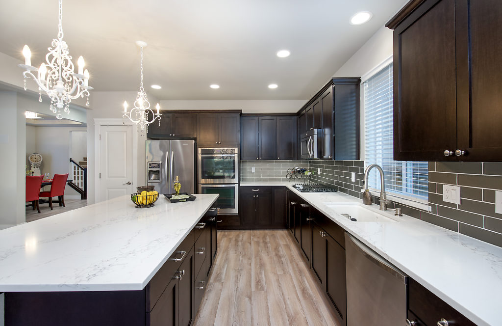 The chef's kitchen is beautiful and functional, thoughtfully designed with quartz counter tops, glass subway back splash, stainless steel appliances, dark cabinets with soft-close hardware and display bays above, a spacious center island and double oven.