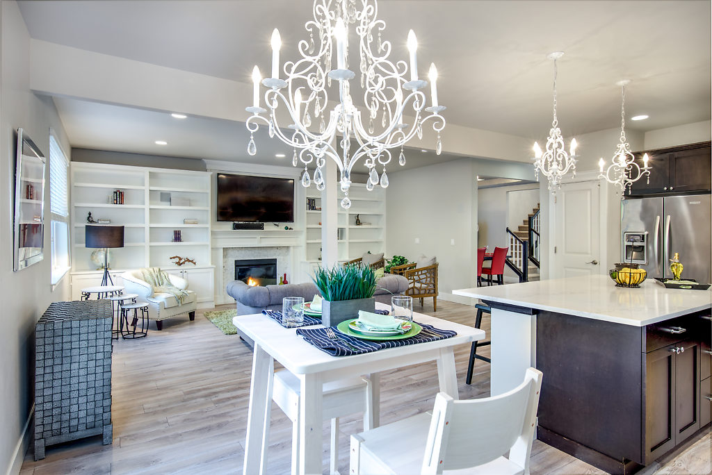 The Great Room is adjacent to the kitchen with a modern open floor plan. Friends and family will love gathering in the great room, with a gas fireplace within a full wall, complete with custom built-in bookcases, and marble tile surround.