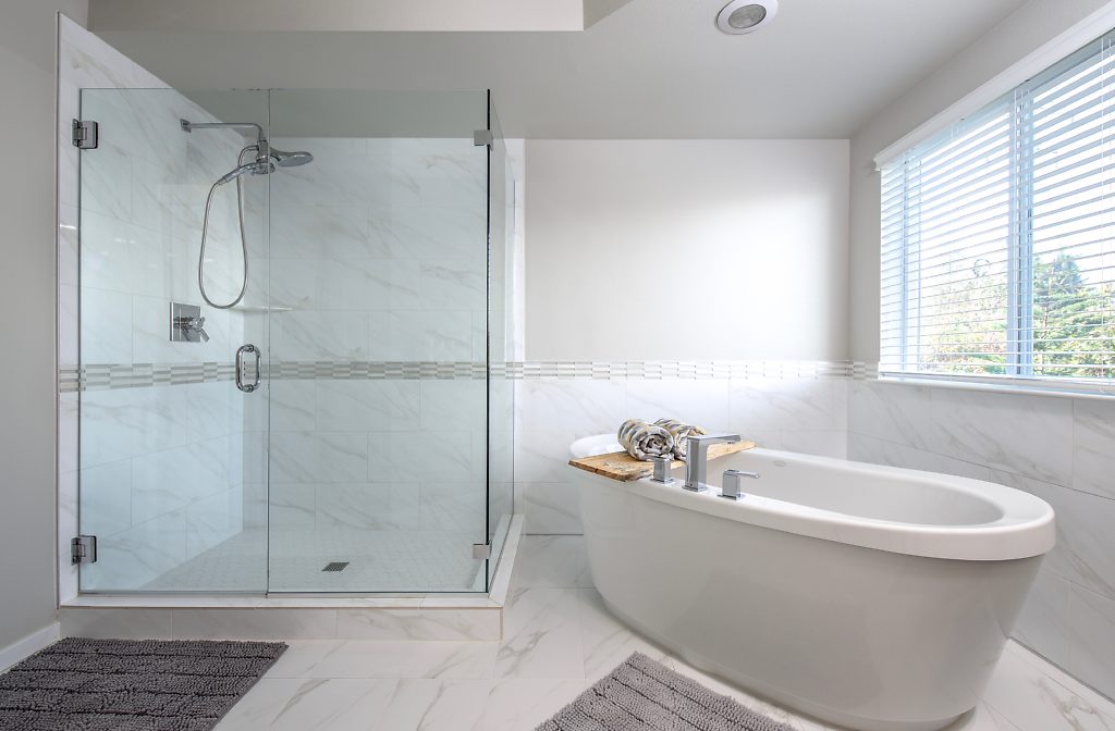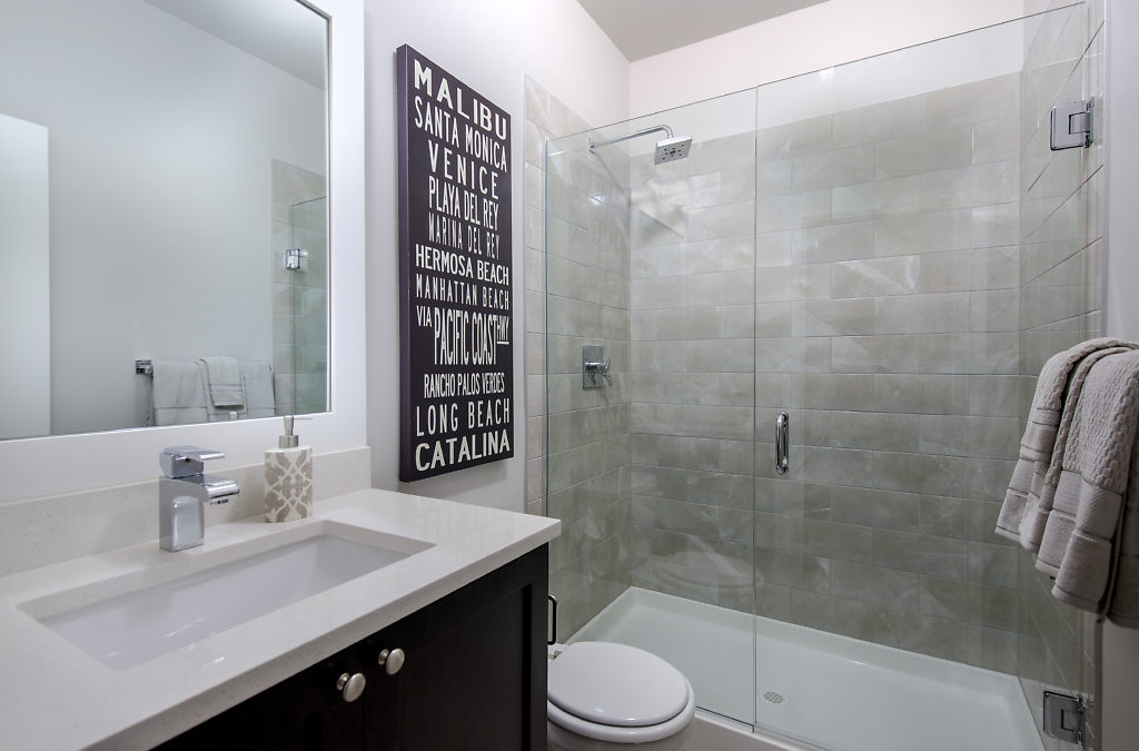 You can choose to use the downstairs bedroom as a den or office; it's a convenient space with a beautiful bathroom right down the hall. The bathroom has quartz counter; glass shower surround and ceramic tile flooring.